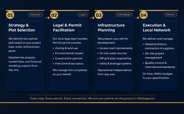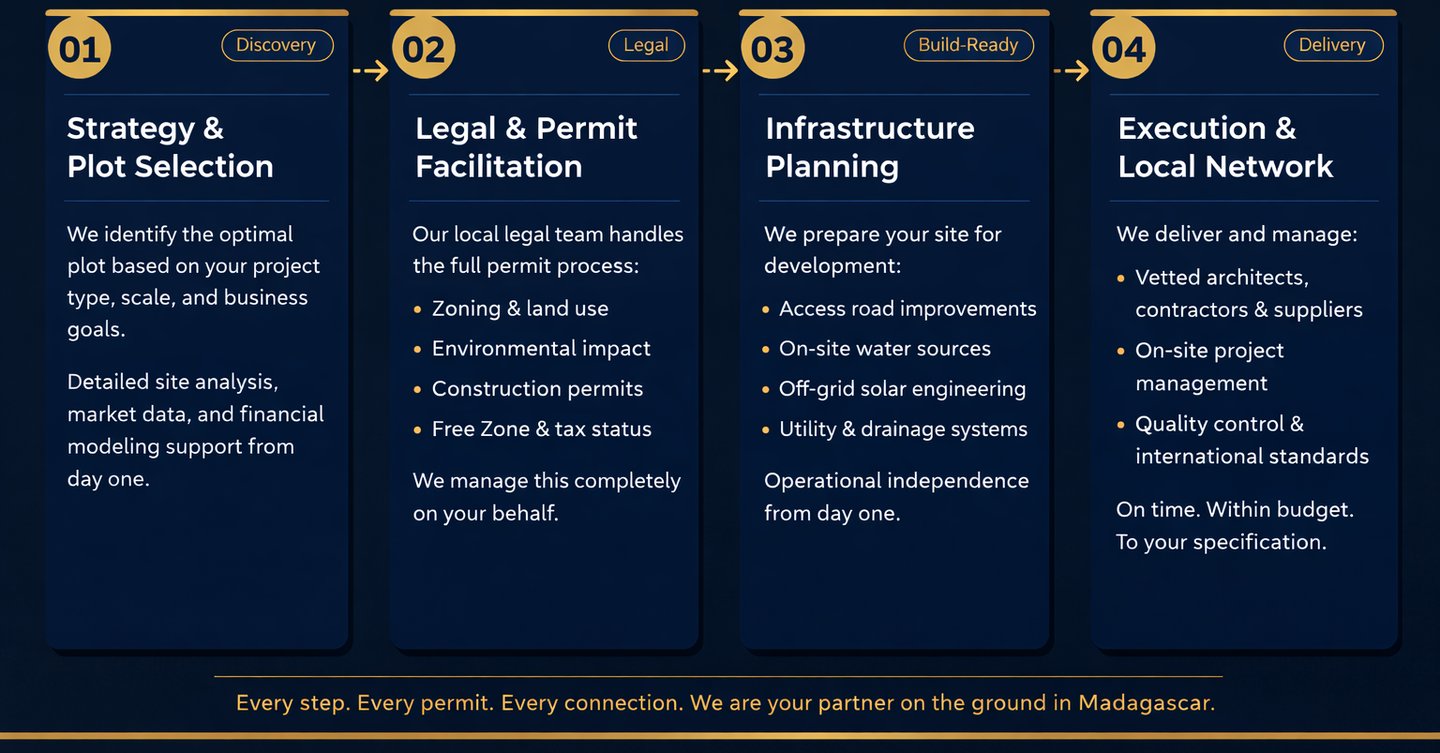 We don’t sell raw land and disappear. We provide a full-service framework that guides developers through the entire lifecycle of a project in Madagascar — from initial strategy to operational launch.